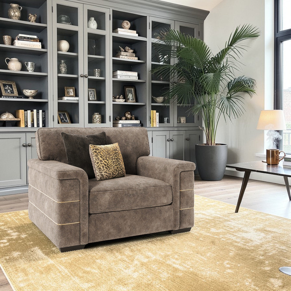 Each piece is defined by its exquisite detailing, featuring distinctive gold piping elegantly traced along the arms and wrapped in ultra-soft dappled velvet fabric.
